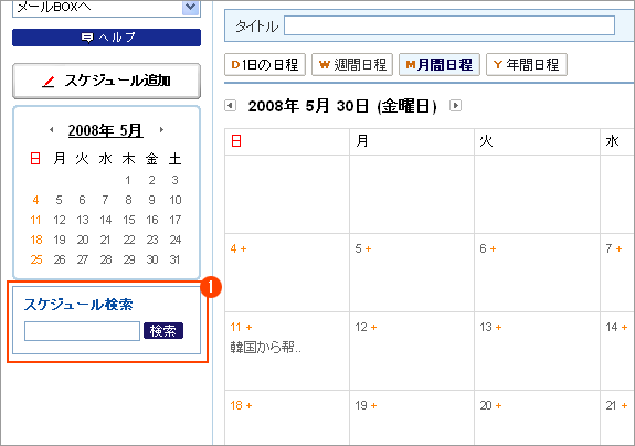 左側のスケジュール検索欄に検索する単語を入力した後、’検索’ボタンをクリックすると、検索結果が表示されます。 ※スケジュール検索は、ビジネスプランとベーシックプランの場合にご利用いただけます。